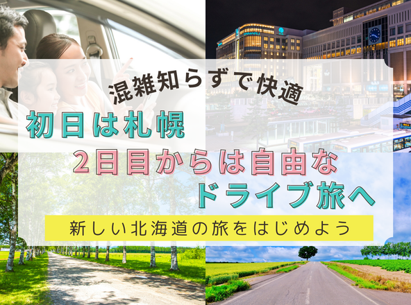 1泊目は札幌、2泊目以降は道内のホテルから選べるフリープラン。レンタカーは2日目から札幌駅近辺の営業所貸し出しで返却は新千歳空港店。遅い時間に到着の方や初日は札幌への移動だけの方におすすめ!